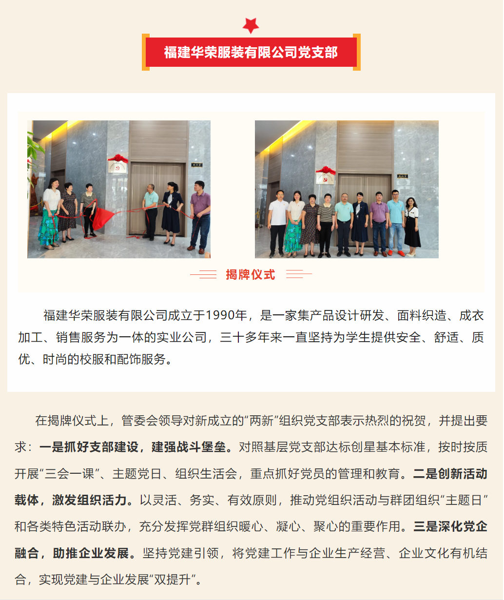 為深入貫徹落實(shí)黨的二十大精神,進(jìn)一步加強(qiáng)“兩新”組織黨建工作,以高質(zhì)量黨建引領(lǐng)“兩新”組織高質(zhì)量發(fā)展,近日,惠安經(jīng)濟(jì)開發(fā)區(qū)新成立萬華新材料有限公司黨支部和福建華榮服裝有限公司黨支部。惠安經(jīng)濟(jì)開發(fā)區(qū)黨委副書記、管委會(huì)副主任劉書藝、林志杰出席揭牌儀式。
